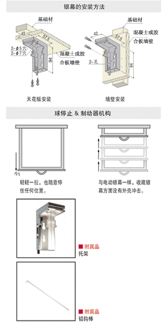 ●与房间美观搭配的新型铝外壳。 ●采用了使银幕平面性保持最佳状态的张力微调修正装置新技术。 ●采用新型设计拆装式外壳和滑动式托架,大大降低了设置量。 ●因搭载球停止—制动器机构[PAT],升降非常顺畅。
