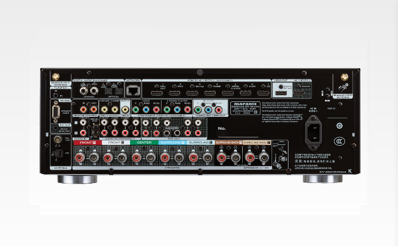 附带8个HDMI输入——1个位于前面板,用于快速连接——均支持HDCP 2.3、4K超高清60Hz视频、4:4:4纯色子采样、Dolby Vision、HLG、高动态范围(HDR10)、3D、和BT.2020直通。视频处理器能将标清和高清视频升频至4K超高清视频。HDMI输入根据可用资源提供的信息自动重命名自己。共有两个HDMI输出。
