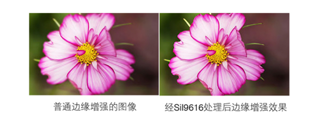 视频平滑技术则能去除图像粗糙的边缘,创建一个高分辨率图像效果,但不会软化整个图像。SiI9616视频处理器芯片提供标准和高清晰两种平滑模式,标准模式可以对原始图像的任何粗糙的边缘进行删除,而在高清晰度模式下,可以用来减少视频在进行高清转换时所引起的粗糙边缘。