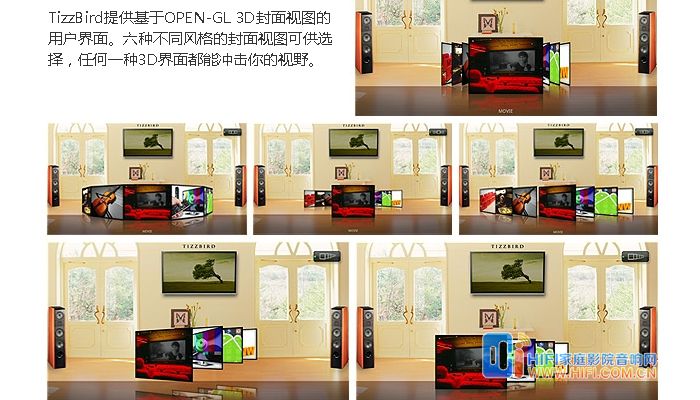 TizzBird智能播放机主界面,支持6种不同显示效果。(可使用遥控器VIEW按钮调节或进入菜单调节)