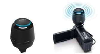 [图注:便携式扬声器以及已安装扬声器的索尼Handycam投影摄像机HDR-PJ580E]