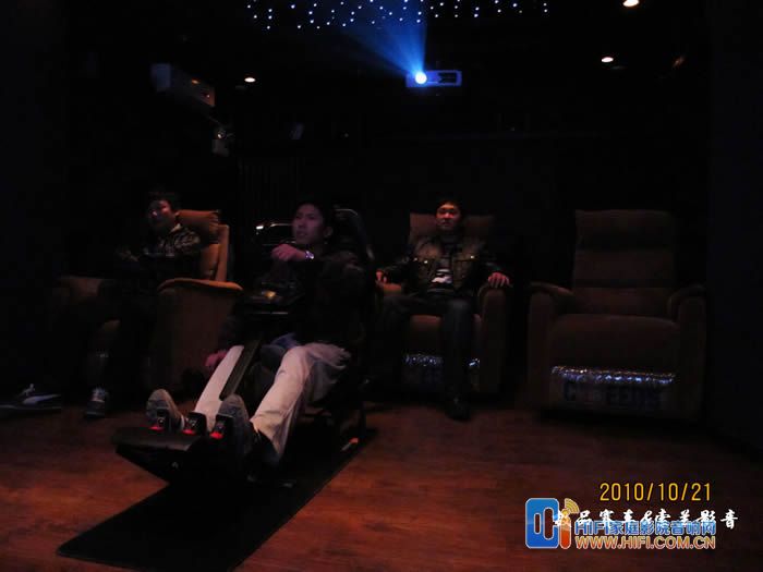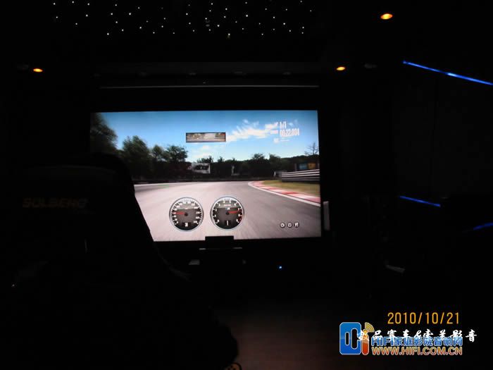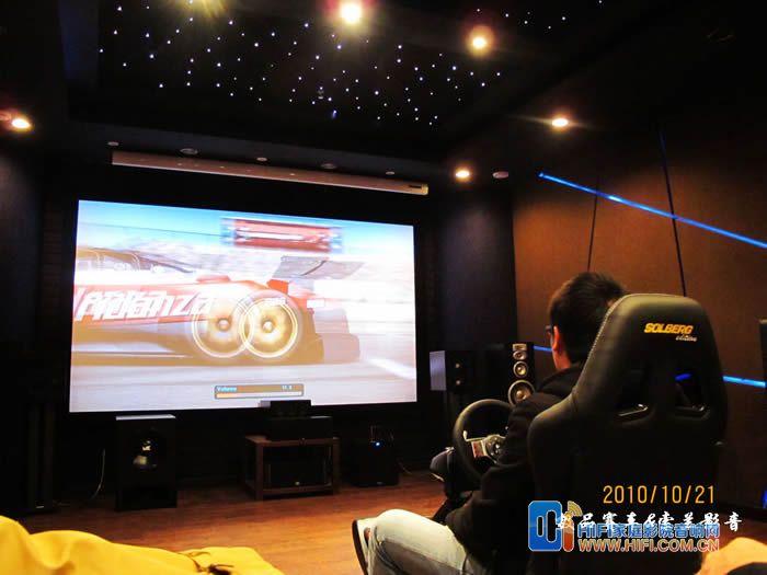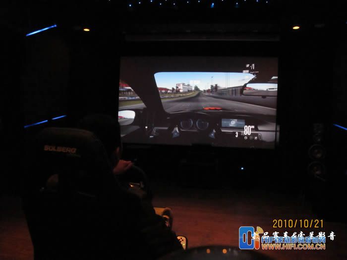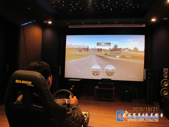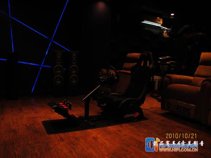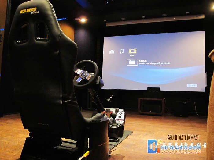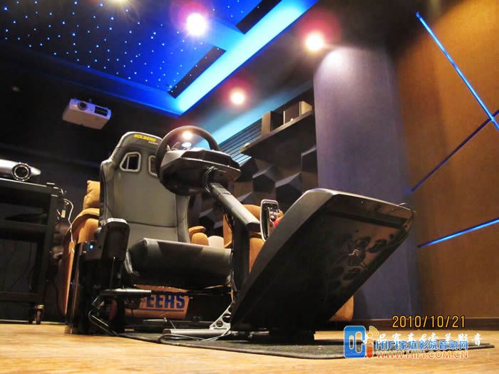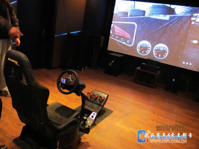 由于罗技这套G27 的USB线不太长,我这里把PS3放在了座椅右侧,用一根长点的HDMI线连接功放,我这里配备的音响设备是一套世博前后级功放推MK的S150一套7.2 音箱。前面炮是MK350的和一个威力登的SPL-1000U,前面的是一块ScreenResearch 的126英寸框架幕, PlayseatS座椅到幕大概3米5左右。