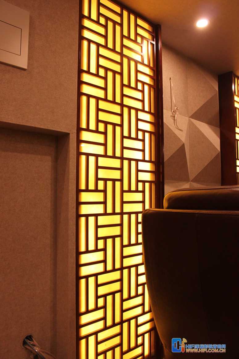 墙面的设计采用镂空实木雕刻装饰的立柱分割大型金字塔声学吸声扩散体。