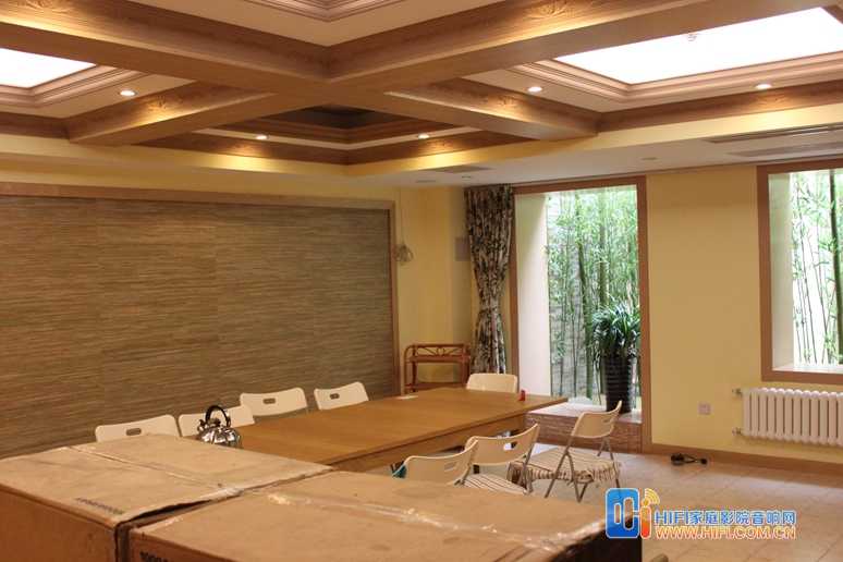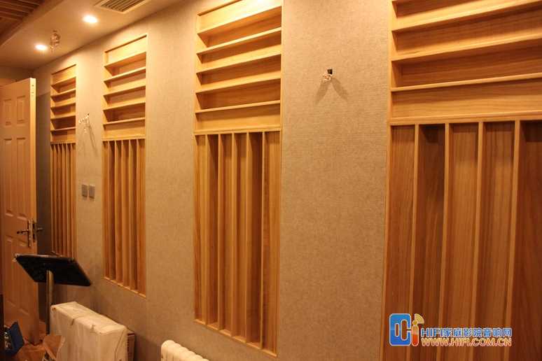 后墙为QRD扩散体二维组合成的扩散矩阵。排列的间隔经过紧密的计算正好可以安放后环绕音箱。QRD扩散体为嵌入式的,嵌入墙内15厘米。采用实木清油经过数十道油漆工艺这些都必须在工厂完成。