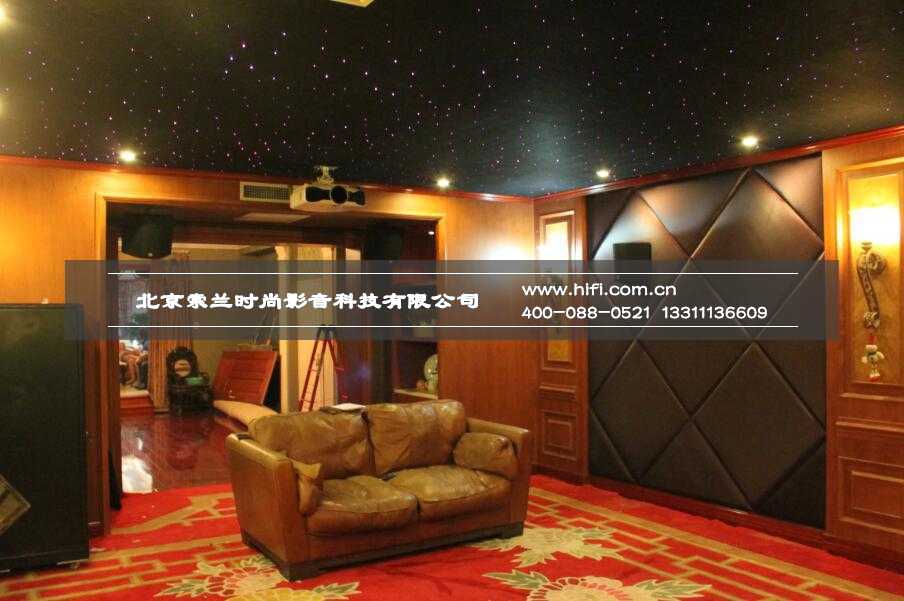 为防止产生共振内填实吸音棉。前墙贴进口无纺布珍珠粉壁纸,为了满足影院方面的声学要求,墙体我们采用软包和二次余数扩散板,顶部采用聚酯纤维吸音板配合光纤做成星空造型处理,使声音的平衡度达到较佳,保真度更高。