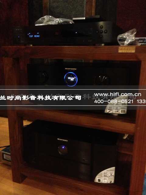 设备柜上是马兰仕前后级放大器和OPPO蓝光碟机。