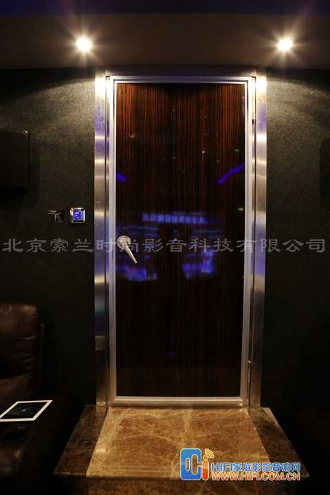 影音室的隔音处理还有一个重要的位置,那就是入室门。普通的门因为材质、结构以及门体缝隙等因素,基本都不具有隔音的性能,或隔音性能很低。因此,选择一樘专业的隔音门可以极大的提高影音室的隔音效果。索兰影音自主研发的声盾隔音门,隔音量可达45dB,无论从门体结构、门芯的隔音处理工艺,到门缝隙的密封处理,都是为更好的隔音性能服务,成为影音室的不二之选。