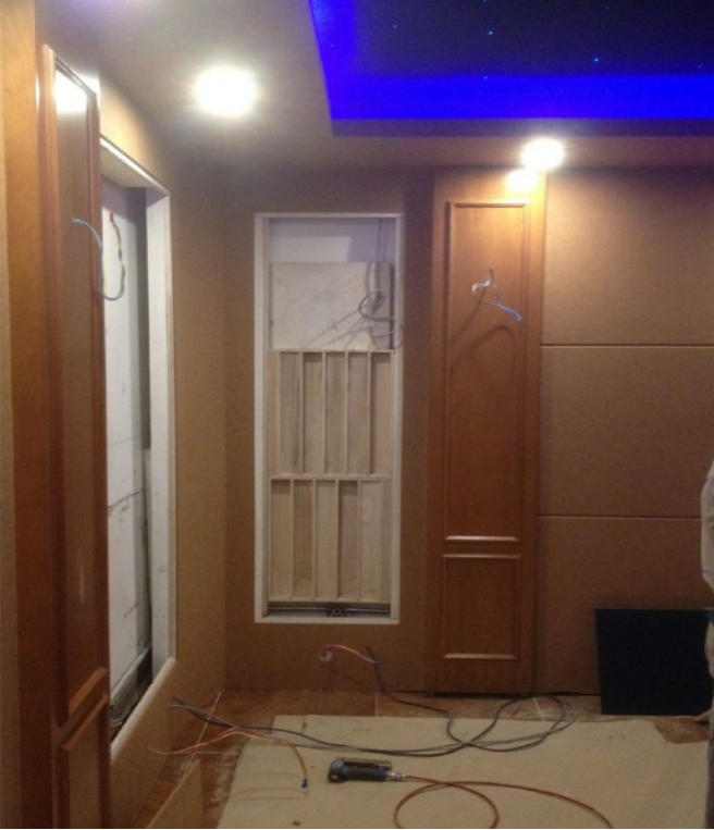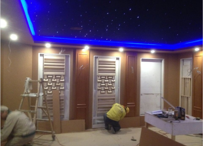 此外,墙面采用了隐藏式声学处理设计,声学扩散体内嵌在墙体空腔龙骨结构中,表面以专业透声布进行装饰,再配以欧式边框,体现影音室内的欧式元素。 欧式风格的入室门与整个影音室搭配的相得益彰。 顶面则采用经典的星空顶,充足的顶面区域,使星空顶更加自然。 表面的吸声材料还对房间内多余的中高频反射具有吸收的作用。