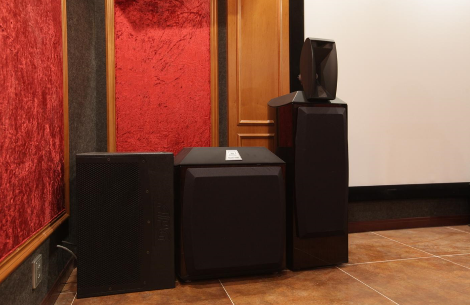这样的声学处理,可以最大程度地减少影音室内的噪声和共鸣,让观影者能够更加专注地享受影片带来的视听盛宴。 当然,在完美的声学环境下,音响设备的选择也是非常重要的。 在这间影音室中,音响设备采用的是JBL ARRAY系列。 这个系列的音响设备是专为私人家庭影院设计的,不仅具有出色的音质表现,还具有高端的外观设计和材料选择。 在这间影音室中,JBL ARRAY1000主音箱、ARRAY880中置音箱和ARRAY1500低音炮摆放在前墙预设的位置,OS画框幕布挂装在两个立柱的中间。