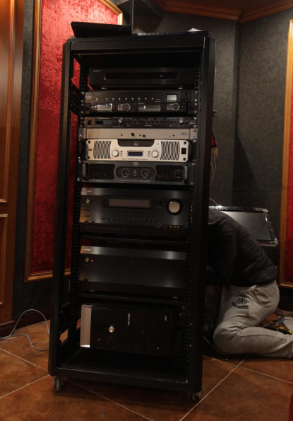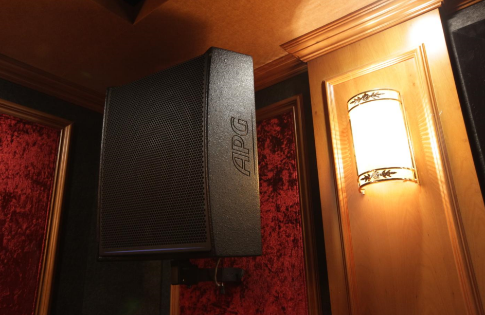 在沙发位置的上方,还配备了两只KEF顶置扬声器,这也是Dolby Atmos区别于普通7.1声道系统的设置。 这两只顶置扬声器作为上方声音音箱,在Dolby Atmos系统中有着非常重要的作用。 所有的这些设备都能够让观众感受到电影场景的震撼和真实感。 除了Dolby Atmos全景声私人家庭影院系统外,影音室内还配置了卡拉OK系统,两只APG DX15卡拉OK音箱安装在前墙两个立柱的左右,同时还配备了APG SB115低音炮。 这样的设计可以满足家庭娱乐的多样化需求,不仅可以观看电影,还可以唱卡拉OK 此时,在大屏幕的前面坐下来,你会感到仿佛置身于电影院里,身临其境的观赏体验让人难以自拔。