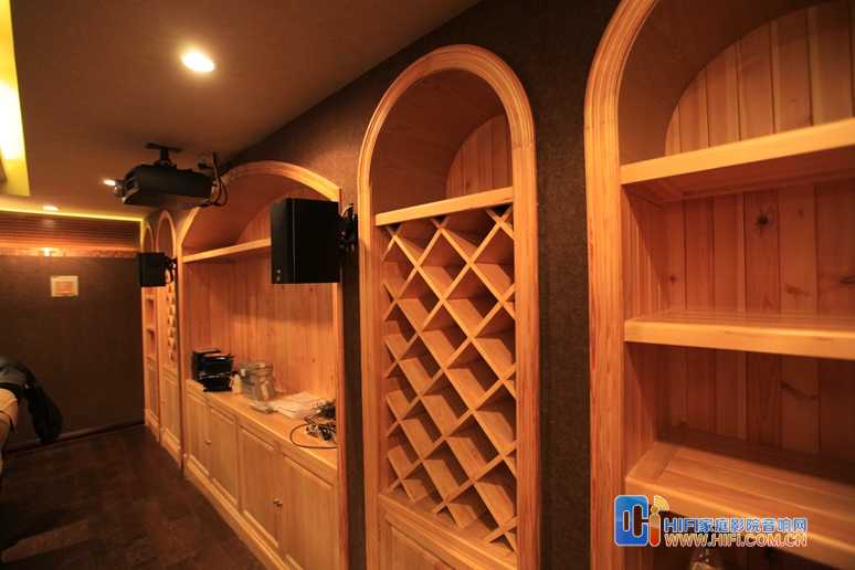 影院的后区域是用松木实木板打造的葡萄酒柜设计采用以中心点为左右对称。这样对低频有很好的扩散作用。同时也解决葡萄酒储藏的问题。最终形成一个非常具有特色的综合型家庭影院。
