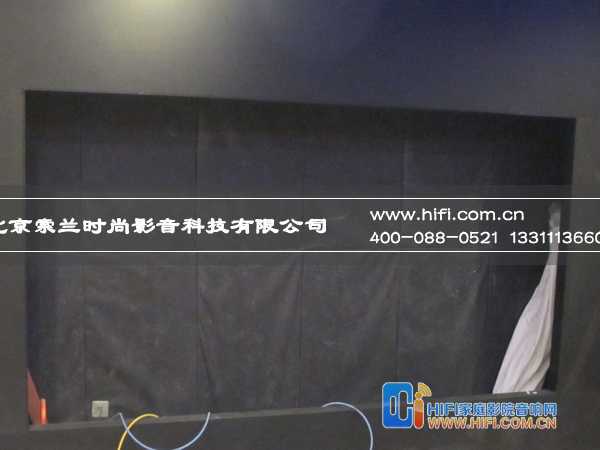 根据业主的要求和房间比例,考虑到房间入室门在靠近后墙的位置,进入房间的第一视觉区域在房间的前部,因此将前墙设计为透声结构,将前置音箱隐藏在幕布后面。