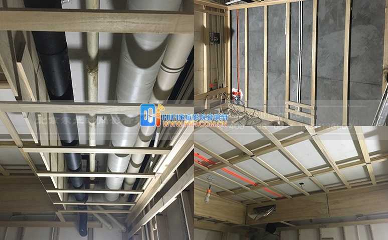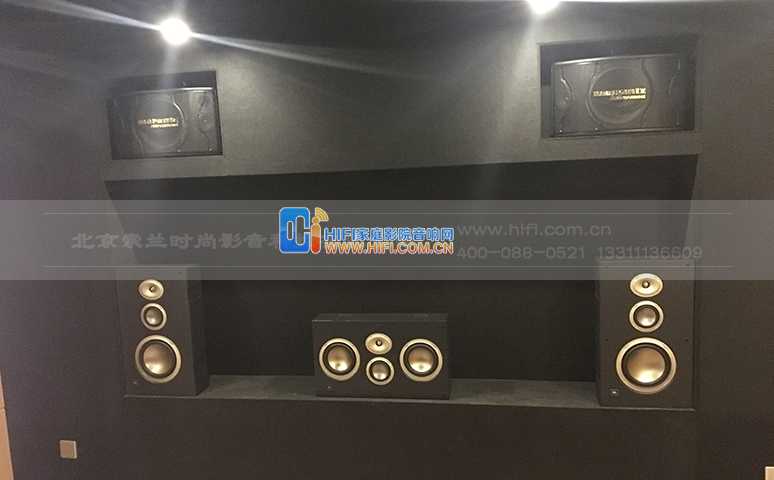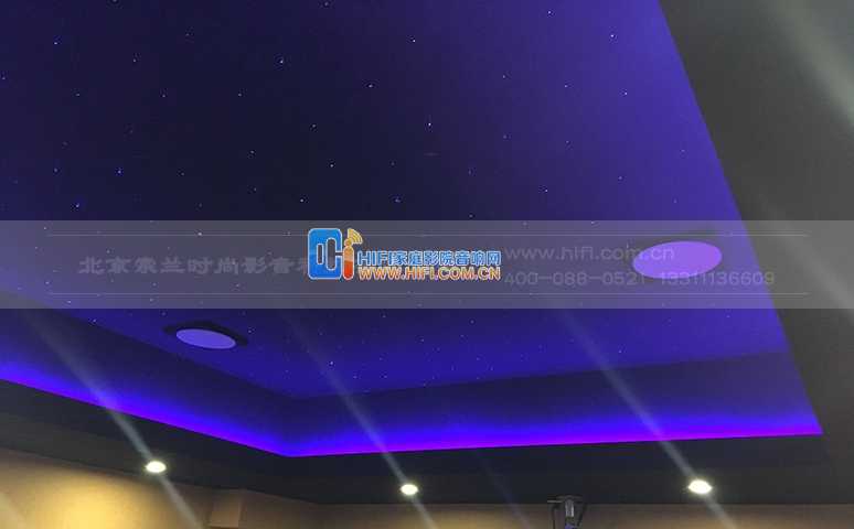 前置音箱与卡拉OK音箱采用嵌入摆放方式,全部隐藏在投影幕布后面,顶面音箱安装采用音箱盒加固,可以看到白色装饰网罩隐藏在星空中,即不会明显注意到它,也不会忽略它的存在。隐蔽与超卓声音性能兼顾。