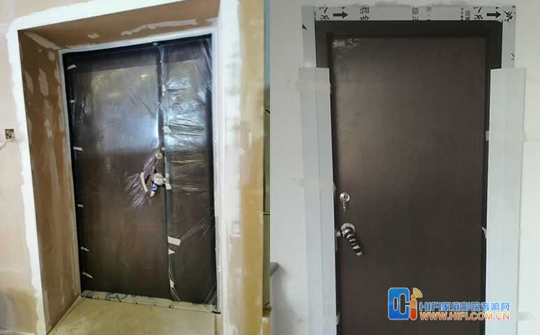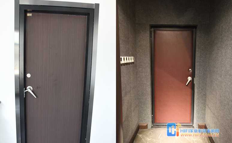 通往楼道的两个门口定制了两樘声盾隔音门,以保证与楼道互不干扰。业主要求尽量无障碍进出,为此我们特别定制了超低2公分门坎,保证门扇开合不受影响及四周密封。
