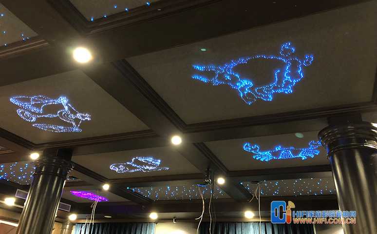 灯光设计根据客户要求,在不观影的时候房间要明亮,在宽大边吊上选用了比常规影音室更明亮的大瓦数筒灯,结合星空顶区域的常规照明筒灯,满足大空间照明需求,同时融入了舞台灯配合KTV娱乐模式,壁灯与灯带作为氛围光源点缀其中。