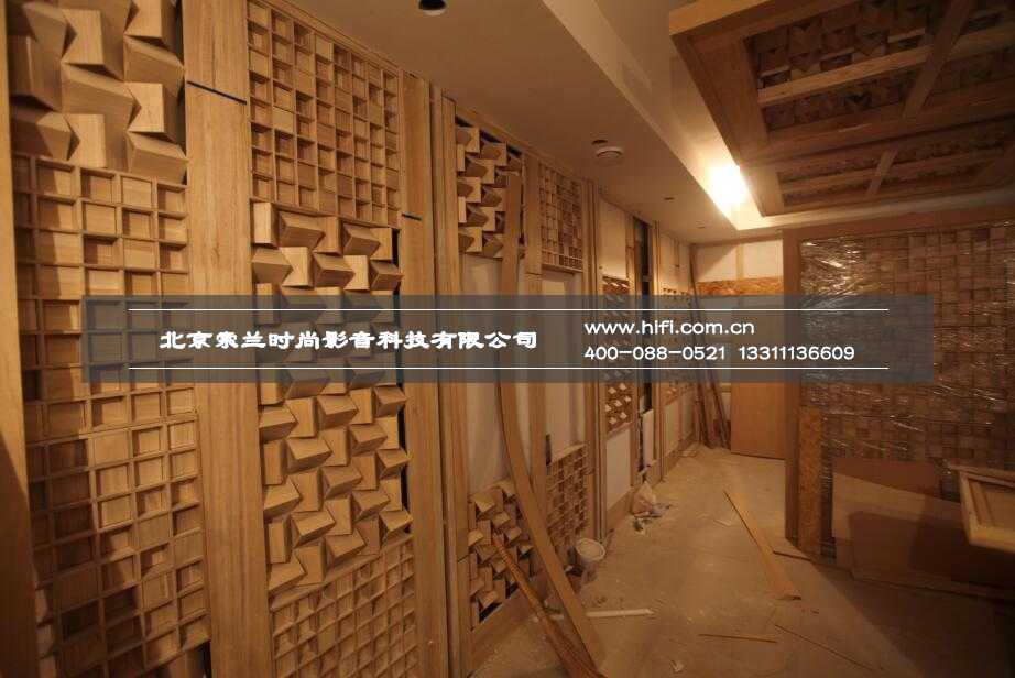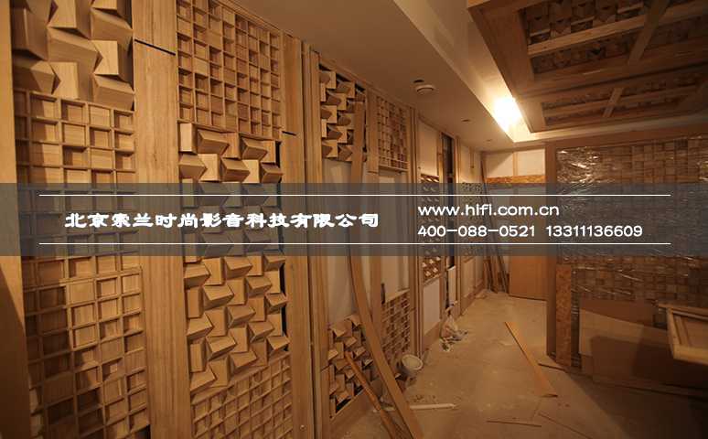 第一反射区对于HIFI视听室和家庭影院影音室都是非常重要的区域,其存在于天花板和两侧墙,一般通过扩散或吸收处理,对第一反射区的声音产生一个良好的影响。对于一个极品HIFI视听室,不能按传统家庭影院的处理方式,使用过多的吸收处理,这样会降低视听室内的混响。我们在这间HIFI视听室设计采用定向声障板来对第一反射区的声音进行扩散,这样可以更有利于HIFI器材的表现。
