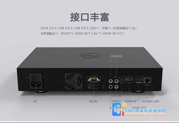SATA 3.0 * 2,USB 2.0 * 2,USB 3.0 * 2, 光纤* 1 ,同轴* 1,AV 视频输出* 1,左右声道输出* 1 ,RS232 * 1,HDMI OUT 2.0a * 1,HDMI IN 2.0 * 1