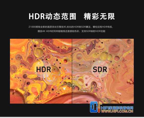 全新的画质优化引擎技术,优化的HDR 转SDR 算法,哪怕没有HDR 电视,播放4K HDR 时同样能精准还原色彩,支持SDR 映射HDR 功能