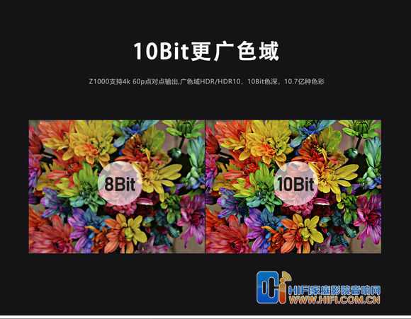4K 60P 点对点输出,广色域HDR / HDR10 ,了10Bit 色深,10.7 亿种色彩