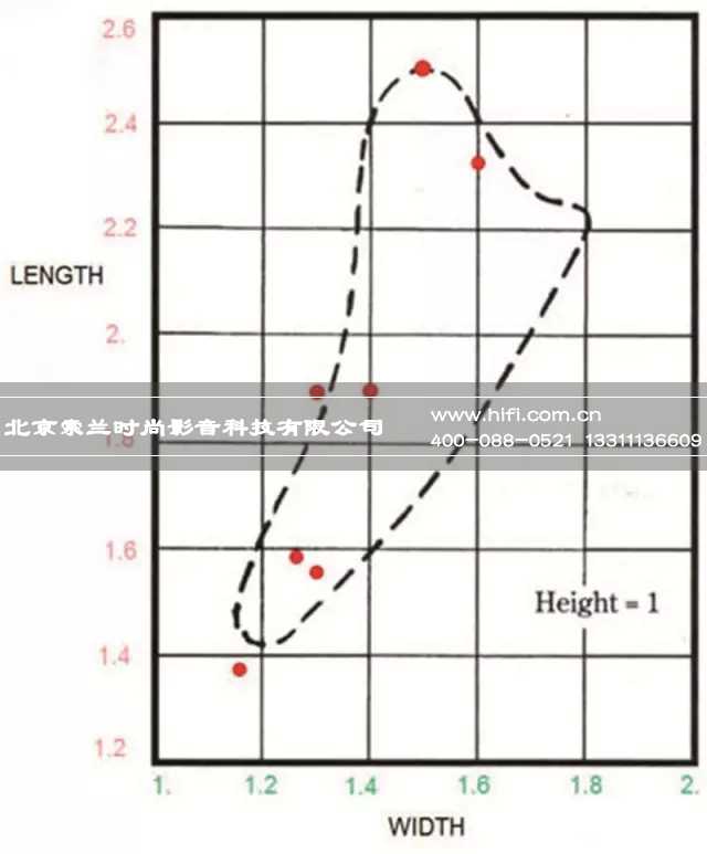对于小房间的比例,经过国内外研究机构多年的研究后发现,房间比例并不能限定于某一特定的比例,而是一个推荐的比例范围,其中就以著名的波尔围线(Bolt-Area)广受认可。顾名思义,波尔围线是由著名的声学专家波尔(Bolt)在1946年所推出的,将生硬的数字比例转变为具体的图像范围。在一定的情况下,我们可以通过波尔围线去寻找合适的房间大小与比例的最佳范围,不过波尔所依据的平均模式间隔作为基础的理论仍然存在缺陷,需要结合其他的理论统计方式来整体考虑,包括了著名的Bonello1/3倍频驻波密度统计法等。