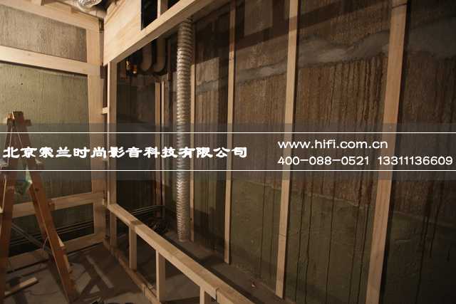 打造“房中房”的空腔结构是家庭影院方案施工的第一步,这种结构不但可以增加影音室的隔音性,还可以安装声学模块,根据影音室的声学特性,通过测算得出模块的使用位置,有针对性的进行声场调整。影音室后墙左下角设置了一个空腔作为设备柜的位置,此处正好是室外楼梯最高阶的底部,空间足够且对室内外都没有影响。