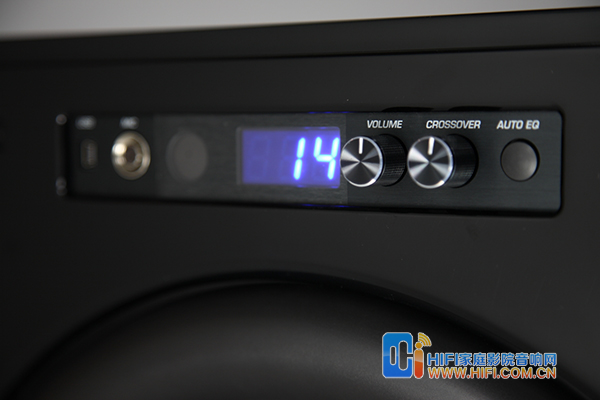 显示屏右边接着是音量控制旋钮,可随时微调超低音的输出音量,此功能也可以用遥控操作。我觉得此一设计真是太好了!DD-15+并不像一般超低音把音量旋钮放在背后,那种感觉象是音量调定了后就不必再更动,但事实并非如此,因为每部电影、每首音乐的录音都不一样,是有其必要针对不同录音来微调低频的量感,才会听得舒服、过瘾。此外,DD-15+也把低通分频点的调整旋钮放在面板上,从40Hz至199Hz,1Hz为一阶,调整时,频率便会显示在中央的数字荧幕上。最右边还有AUTO EQ按键,压住5秒即可启动自动EQ功能。