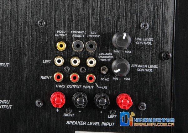 High-Pass Output又有什么用处?它是将讯号加以高通分频后,再输出给其他扩大机,可用于建构2.1声道系统。此一高通分频讯号又可透过背板上的High-Pass Crossover切换开关,来决定分频点是在80Hz还是100Hz,不过此一功能应该只在前级与后级分离的系统才能使用。背板上还有2个音量调整旋钮:Line Level与Speaker Level。它并不是用来调整超低音的音量,刚刚说过,音量旋钮位在面板上,或经由遥控器操作也可以。这2个音量旋钮是为了调整Line输入(RCA端子)或Speaker输入的输入音量。