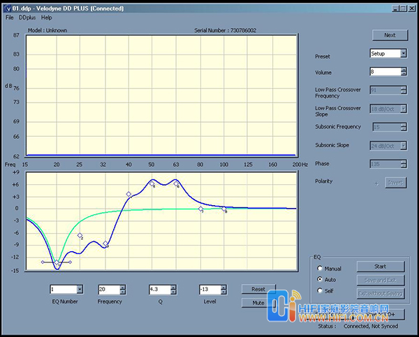 设定Auto-EQPlus就要使用测试音光盘了。光盘内是一小段由低至高的测试音,不过它会重复无数次,所以只要一直播着就好。启动Auto-EQPlus后,DD-15+一开始并不会发出声音,只会听到测试音的原音(从其他声道播放出来),因为DD-15+要先量测系统与空间的原始频率响应以做为基准,接着DD-15+便会开始自行调整。接下来的每一次测试音听起来都不太一样,那是因为Auto-EQPlus正在工作,它会自行改变测试音,然后再收音、再调整、再收音、再调整….直到完成程序。Auto-EQPlus整个过程约10分钟,过程中除了量测主声道喇叭的低频响应,来决定超低音的分频点与量感外,也会一并量测空间中的反射音与驻波状况,看看是哪些频段太多了,或是哪些频段被空间吃掉了,然后进行调整,调整内容除了8段等化外,还包括音量、频率响应、分频参数以及输出相位等,比Self-EQ完整多了。