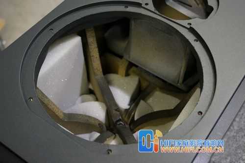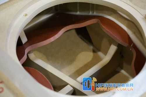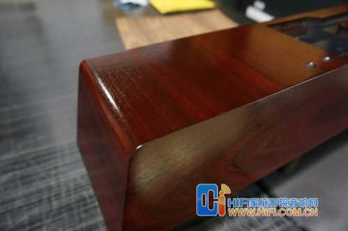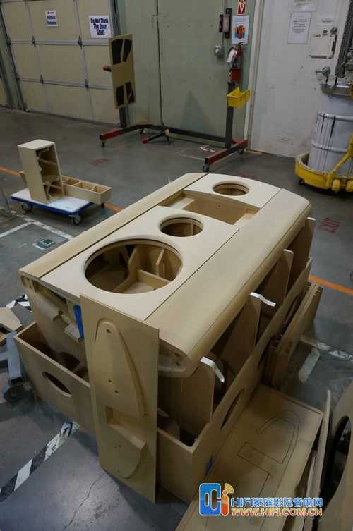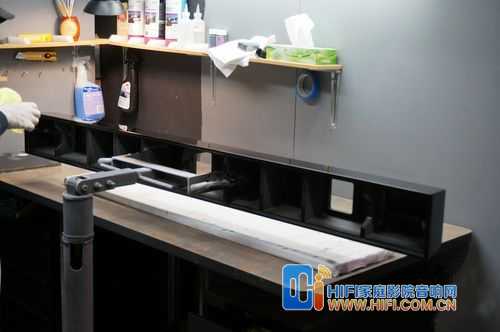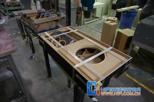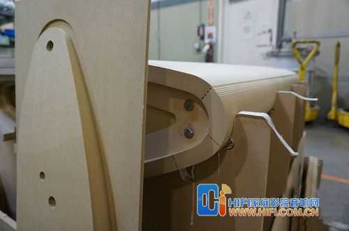 很幸运,我看到了正等待胶水干透的Cinema Reference的箱体。这是Triad的一款旗舰,箱体呈曲面造型。要知道,幸亏有了数控机床。在我刚刚开始接触音响时,这样的曲面设计是个相当复杂的过程,它完全有赖人手的打磨,耗时耗力,产量低下。好在,这一切都过去了。我还注意到。Cinema Reference的箱体,在外侧是看不到任何连接端的。没有螺钉、螺栓或任何可能破坏一体化设计的玩意。内部的结构件都被精准打磨,安装妥当,再用外部的部件覆盖住。让你见到的,是堪称完美无瑕的最终制成品。