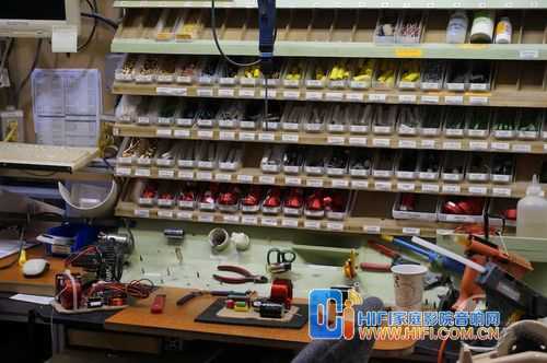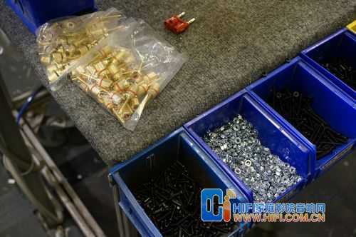 喇叭单元和接线柱被分别安置在专用的架子上,那些单元标明了各自的型号及对应的音箱,根据需要来选择安装。Triad表示,它们用的都是最好的喇叭单元,像是SEAS(西雅士)或Scan-Speak(绅士宝)的制品。这些喇叭单元不便宜,每个都得花上几百美元。作为音箱中最核心的部件,Triad是愿意为此投入的。
