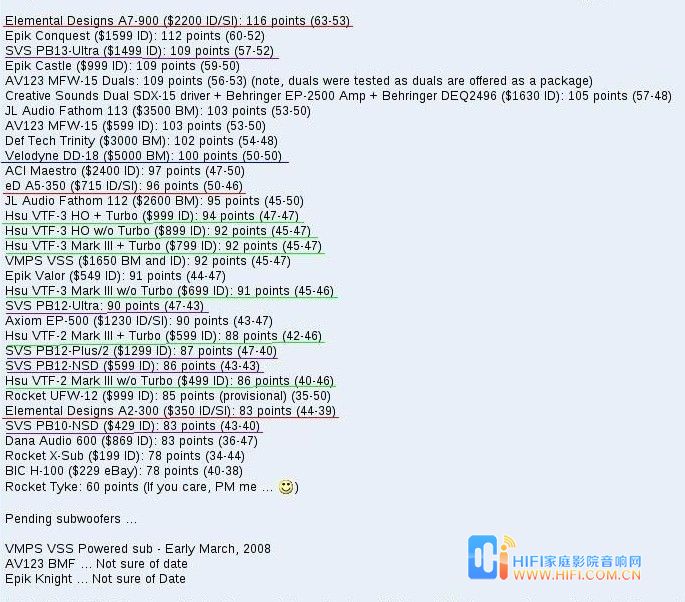 这个表在美国有相当的影响,购买低音炮的用户一般会查这个表,用google搜索英文"subwoofer ranking"出来的第一个就是它.全球低音炮主要来自美国公司,目前在国内有售比较好的炮也是美国炮.以前俺提到的三个公司HSU,SVS,ED的各款炮都在表内,已经用不同颜色下划线标出.还有一家Epik是新贵,目前在美国有超过其他三家之势.