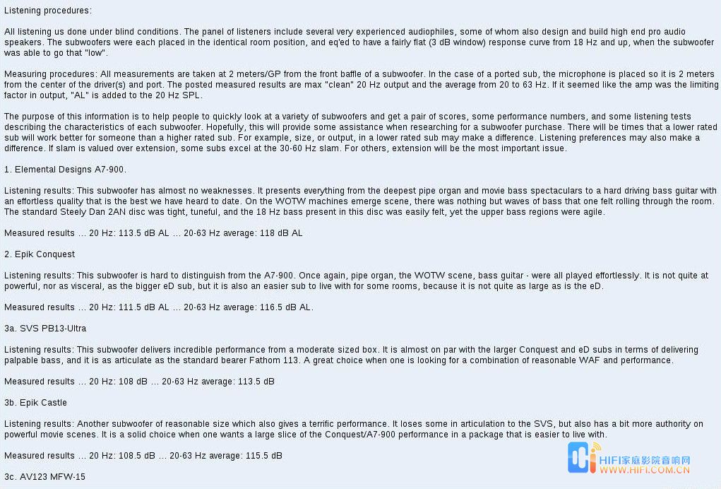 唯一特殊的就是这低音炮,和其他类型音箱比起来,低音炮听音上要相对简单些,因此可以归纳出一些听感指标,如下潜深度,量感,层次感,速度感,结实度等,因此有可能对不同炮按照这些指标进行对比,从而排名也是说的过去的.当然,听音感受因人而异,以下排名仅供参考.这个表不是官方排名,而是美国民间一个网名为Craigsub音响爱好者对在美国发烧用户中普遍使用的各款炮进行的听感评测。