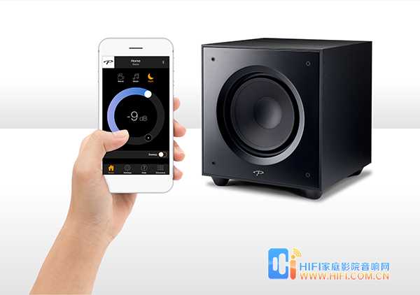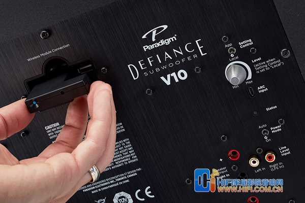 此外,为了让超低音在空间中的摆位更自由不受线材拘束,在喇叭背板上方有一个凹槽,可以安装Defiance WT无线模块(选购),采用2.4GHz无线传输低频讯号,最远传输距离为50英尺(15.24公尺)。