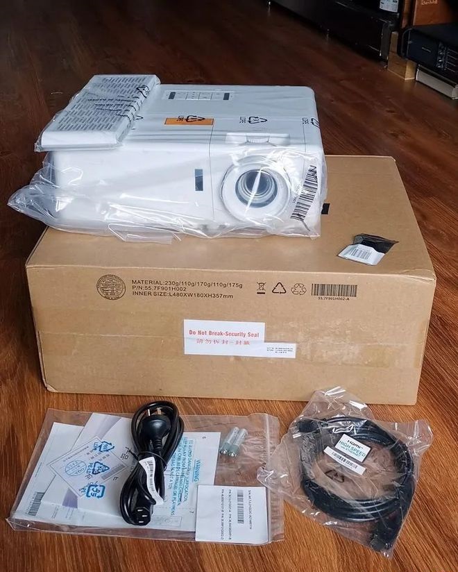 包装箱内的全家福:主机、防尘板(额外赠送)、WIFI接收器、电源线、HDMI线、遥控器(漏拍了)、纸面说明书等。