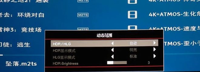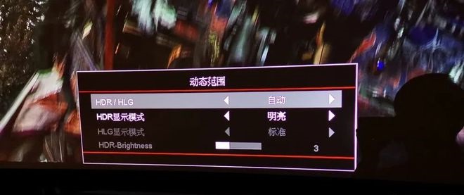 这里的动态范围,相比886来说,多了HLG和HDR亮度调节选项,因为我是使用的HDMI3号口,所以这里的HDR亮度不可调节。