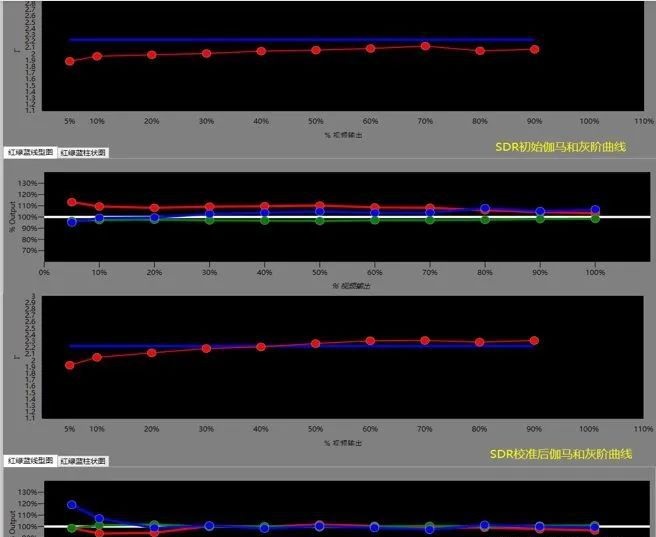 首先来看下SDR的伽马和灰阶曲线,初始伽马曲线比较平滑,校准后5%和10%这里往下偏移,证实了0.47芯片的黑位表现的确不好,发灰发白,而灰阶曲线经过校准后,红、绿、蓝三色自20%——100%均重合,达标!