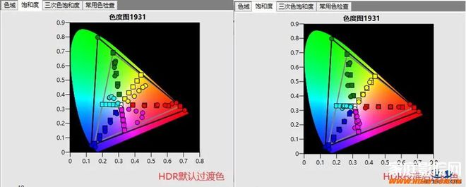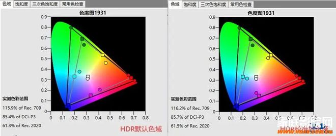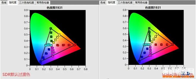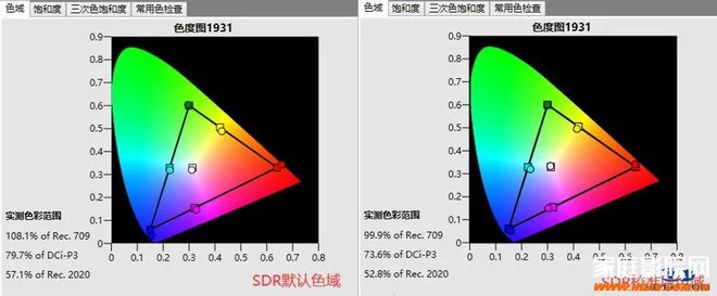 SDR默认色域偏移不大,经过校准后轻松达标,符合100%的709色域标准。