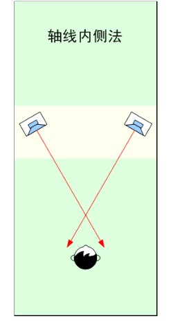 摆法:首先将音箱摆在房间的三分之一至二分之一长度之间,然後分别将音箱尽量靠侧墙,如果房间太宽的话则不一定要紧靠侧墙。音箱的向内角度要大于45度以上,聆听位置要在两个音箱的投射角交叉线交点之后约0.5-1公尺之间。