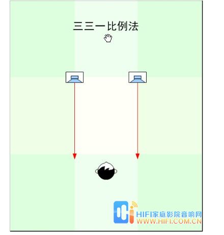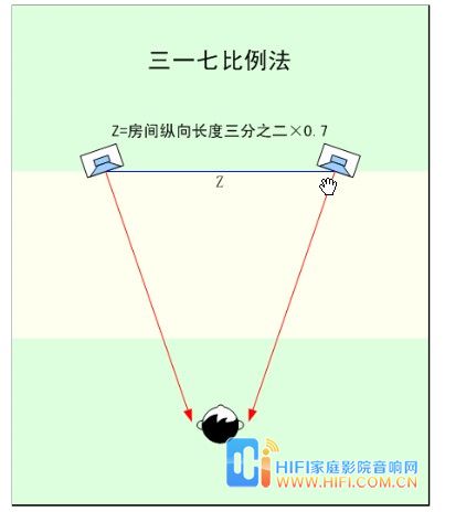 效果:此法亦用于尺寸较大、比例均匀的空间。它与「三一七比例法」的精神是一致的,唯一与「三一七比例法」不同的是二音箱之间的间隔较窄。此法亦可得到平衡的声音与宽深的音场。