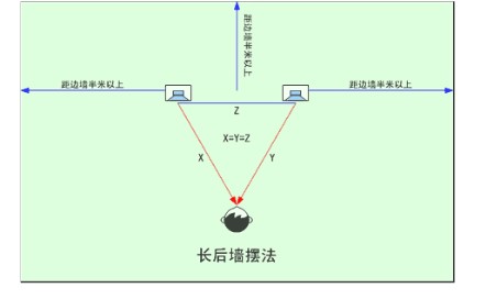 摆法:在一个长方形的房间里,一般玩音响的经验,都会以短边为音箱的后墙。但这个“长后墙摆法”却反其道而行,把长边为音箱后墙。音箱要离开後墙起码要1米以上,而音箱与侧墙的距离起码要半米以上。两个音箱之间的距离与聆听者的位置画等成一个正三角形,两个音箱的向内拗投射角度也要起码45度以上。聆听位置不可贴墙,至少要留一米的距离。
