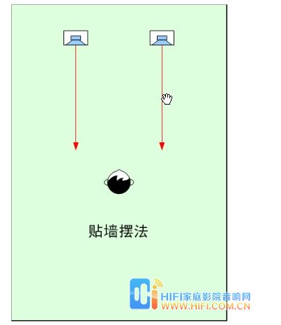 摆法:这是最古老的摆法。将音箱贴近后墙摆,不论是距离后墙50公分或30公分、20公分都没关系,自己去调配即可。通常音箱不需要向内投射角度。