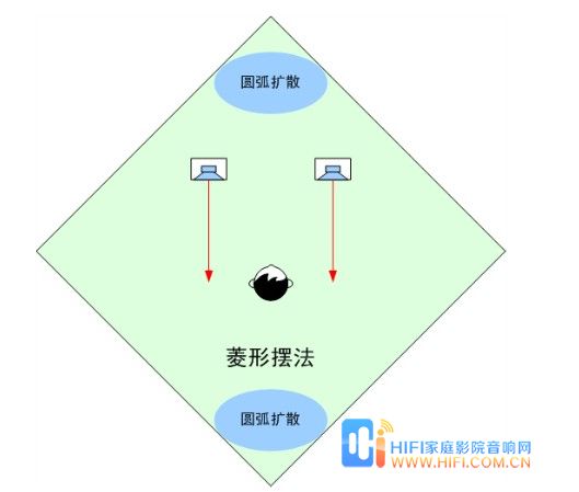 摆法:此法只限正方形空间使用。将正方形空间视为菱形,音箱摆在菱形二边靠墙处。音箱后面的菱形尖角与聆听位置后面的菱形尖角要做圆弧或圆柱声波扩散处理,二音箱不宜靠侧墙太近。