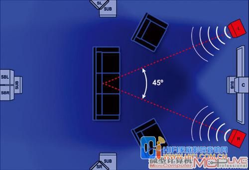 如图3所示,中置音箱摆在12点钟方向、前置左/右环绕音箱分别摆在11点钟和1点钟方向,前置左/右环绕音箱应该与“皇帝位”构成约45°夹角。中置音箱和前置左/右环绕音箱尽量安装在同一高度,并与用户坐下时的耳朵高度齐平,这样才能获得最佳的音场以及正确的人声对白定位。