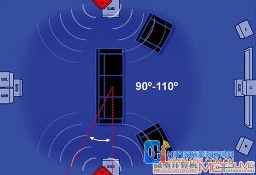若在此高度有电视机等阻碍了中置音箱的摆放,可适当向上或向下以不超过0.3m的距离摆放,再对音箱的辐射方向进行调整。这里需要纠正新手的一个错误习惯,将前置左/右环绕音箱的中置音箱摆放在一对平行线上是不对的。正确方法是,中置音箱和前置左/右环绕音箱的高音单元应该直接对准用户的头部。