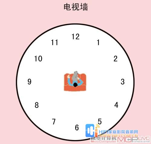 音箱摆位尽管因人而异,但也要遵循一定的规律。为便于理解,我们不妨以时钟平面来指示方位(图1),假设用户的座位(即“皇帝位”)为时钟的中心,则正前方为12点钟方向、正后方为6点钟方向、左侧为9点钟方向、右侧为3点钟方向。
