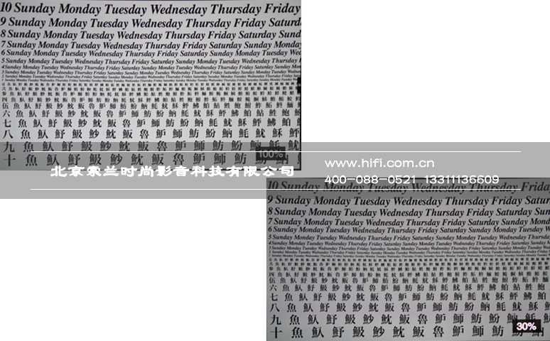 文字解析度测试,依然难不倒明基W3000,在实际观影中,当文字所他投影出的亮度在100%时,文字可清晰辨别,中间最小的字体略有点不清晰,但依然可以认出。尤其是在亮度下降到30%的状态下,中间最小的字体依然清晰可辨,由此可见W3000的亮度之高。