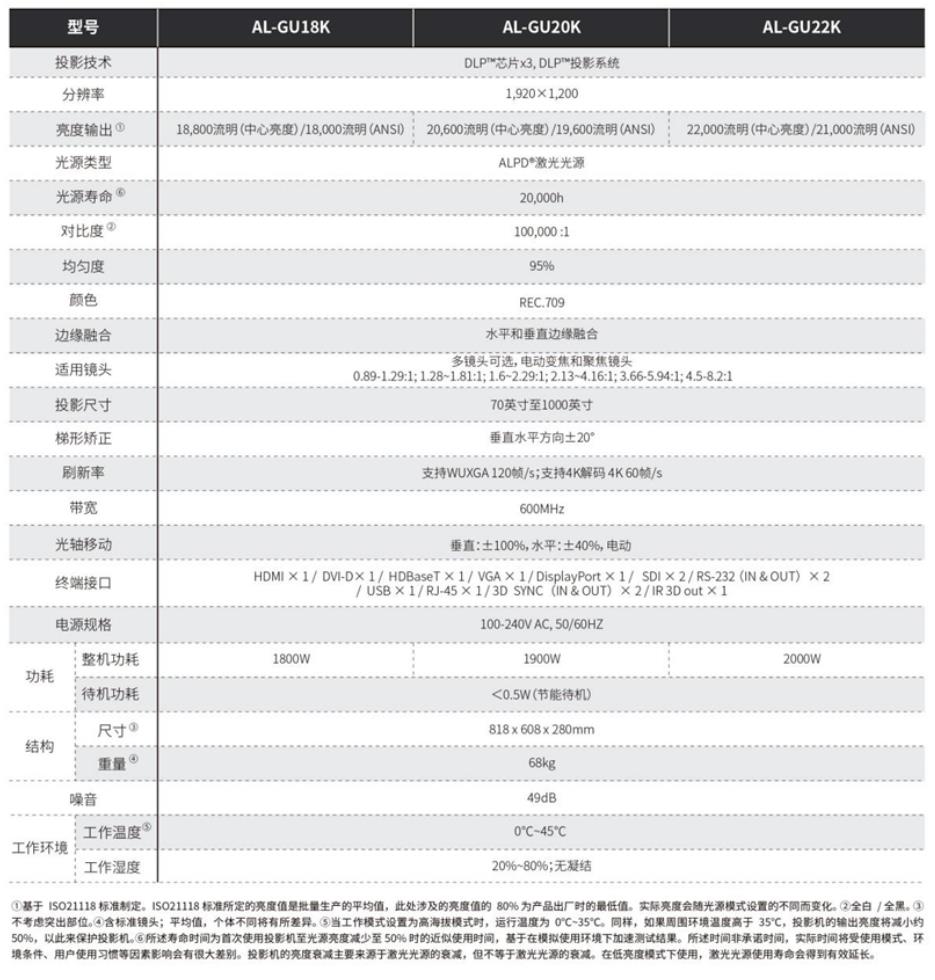 本次推出的G系列新品包含AL-GU18K、AL-GU20K与AL-GU22K三款机型,基础参数方面分别对应18800lm、20600lm与22000lm中心亮度,填补了光峰工程产品矩阵在这一亮度区间的空白。