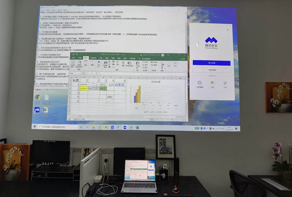 最后我们来简单的构建一个小场景~可以看到在连接电脑后,一个能够大屏清晰显示文字、图表;兼顾沉浸式在线会议体验的办公场景便轻松布置完成。作为显示端,投影影像看似只是完成了简单的内容呈现工作,但其实在大多场景下,用户需要的只是快速将内容分享出去,无需复杂的连接、调试工作,仅通过一台投影机便可实现具备大屏优势的内容分享,这就是用户想要达到的真实目的,而事实证明,索诺克LS38DH完美地做到了这一点。