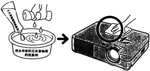 4)、如果污垢难以擦去,可将布在用水冲淡的无有害物质洗涤剂中浸湿,拧干后擦拭投影机。