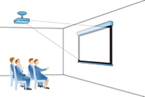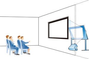 在电影院,投影机设置在投影幕前面投射的方式,只要具备了投影机和投影幕就不需要